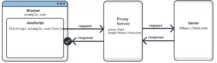서버에서 요청을 하게될 때에는 브라우저의 규약인 CORS 정책에 영향을 받지 않습니다. 그러한 이점을 이용하여 Proxy Server라는 출처를 통하기 때문에 CORS 정책을 위반하지 않게되어 우회 할 수 있게됩니다.