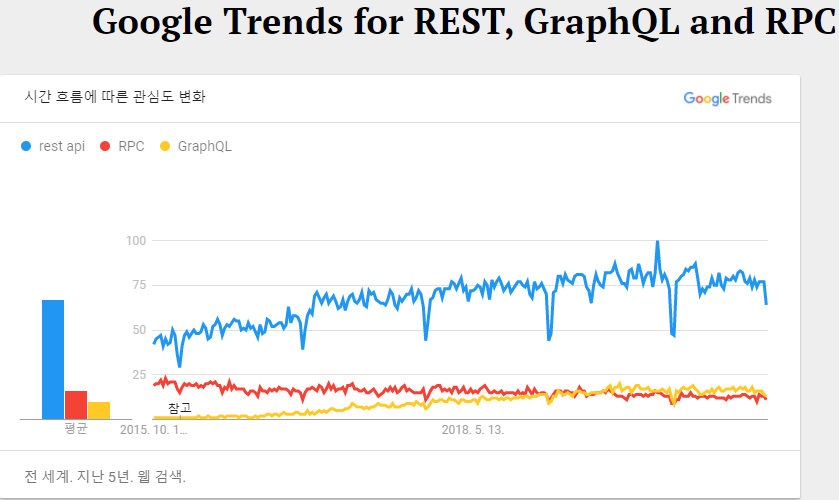 GraphQL은 아직 Rest-API보다는 많이 사용되고 있지는 않습니다. 하지만 꾸준히 증가하고 있으며 관심도 또한 낮지 않다는 것을 알 수 있습니다. 저도 처음엔 RestAPI로 충분히 할 수 있고 Chrome Debugging에서 쉽게 문제 되는 부분들을 확인할 수 있다는 점에서 GraphQL이 궂이 필요할까라는 의문이 있었고 아직까지는 GraphQL 관련 Tools가 성숙하지 못한 부분과 학습에 시간이 드는 비용이 있기에 GraphQL을 고려하지 않았지만 막상 프로젝트에 적용하고 난 후에 좀 더 Front-End에 집중할 수 있어서 만족도가 굉장히 높은 프레임워크가 되었습니다. 단점이 되는 부분들이 좀 더 보강된다면 GraphQL의 사용도가 증가할거라 봅니다.