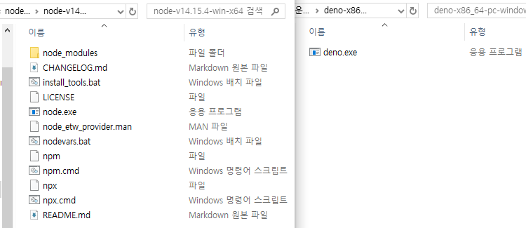 Deno는 종속성이 없는 단일 실행 파일로 되어있습니다. windows 환경에서 node.js(좌)와 Deno(우)의 압축파일을 해제 해보면 비교가 될 것 같습니다.
