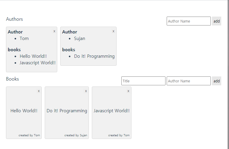 카드의 X 버튼을 클릭하게 될때에 id를 인자로 전달하여 저자 또는 책의 목록을 제거하도록 하였습니다.